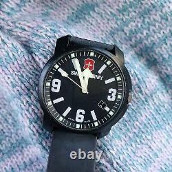 This rare vintage Victorinox Swiss Army wristwatch boasts a sleek black case and band, with an analog quartz movement for precise timekeeping. The watch is Swiss made and features water resistance up to 50 meters. It comes with no original box or papers and has not been customized in any way. The dial color is also black, providing a sharp and stylish look.